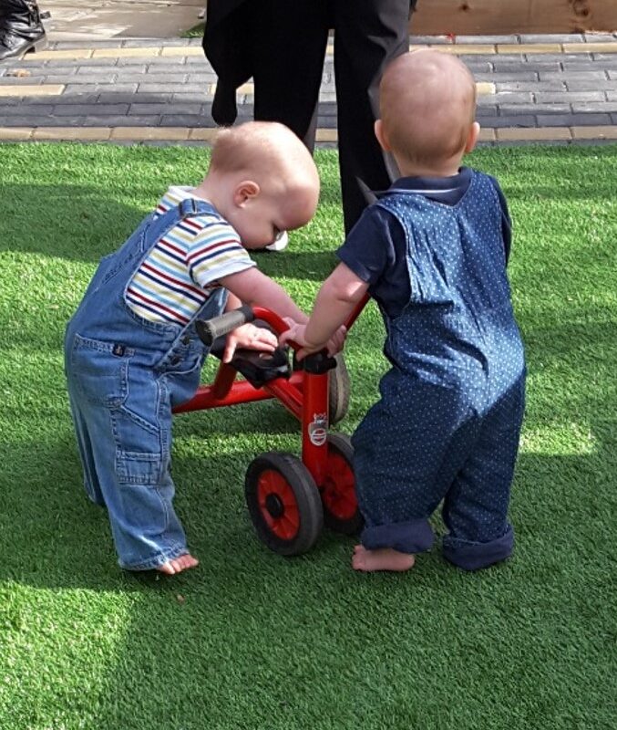 Observation is woven throughout our practice at South Acton, a professionally informed skill which helps us to tune into our children’s development, play, language and interests. The Baby Hour Groups and Stay and Play sessions are an invaluable opportunity to observe the children’s play alongside their parents and talk together about what we see them doing and saying. Observing Hugh and Hamish at Stay and Play with their Mum, we would ‘watch, wait and wonder’ (Fisher, 2016) as their play unfolded, often taking photographs, and adding a short narrative, which became a learning story, explaining what the boys were doing and the meaning behind it. A learning story called “Trike and garden fun at Stay and Play!” captured Hugh and Hamish’s curiosity, play and exploration as they collaborated to find out more about the trike!